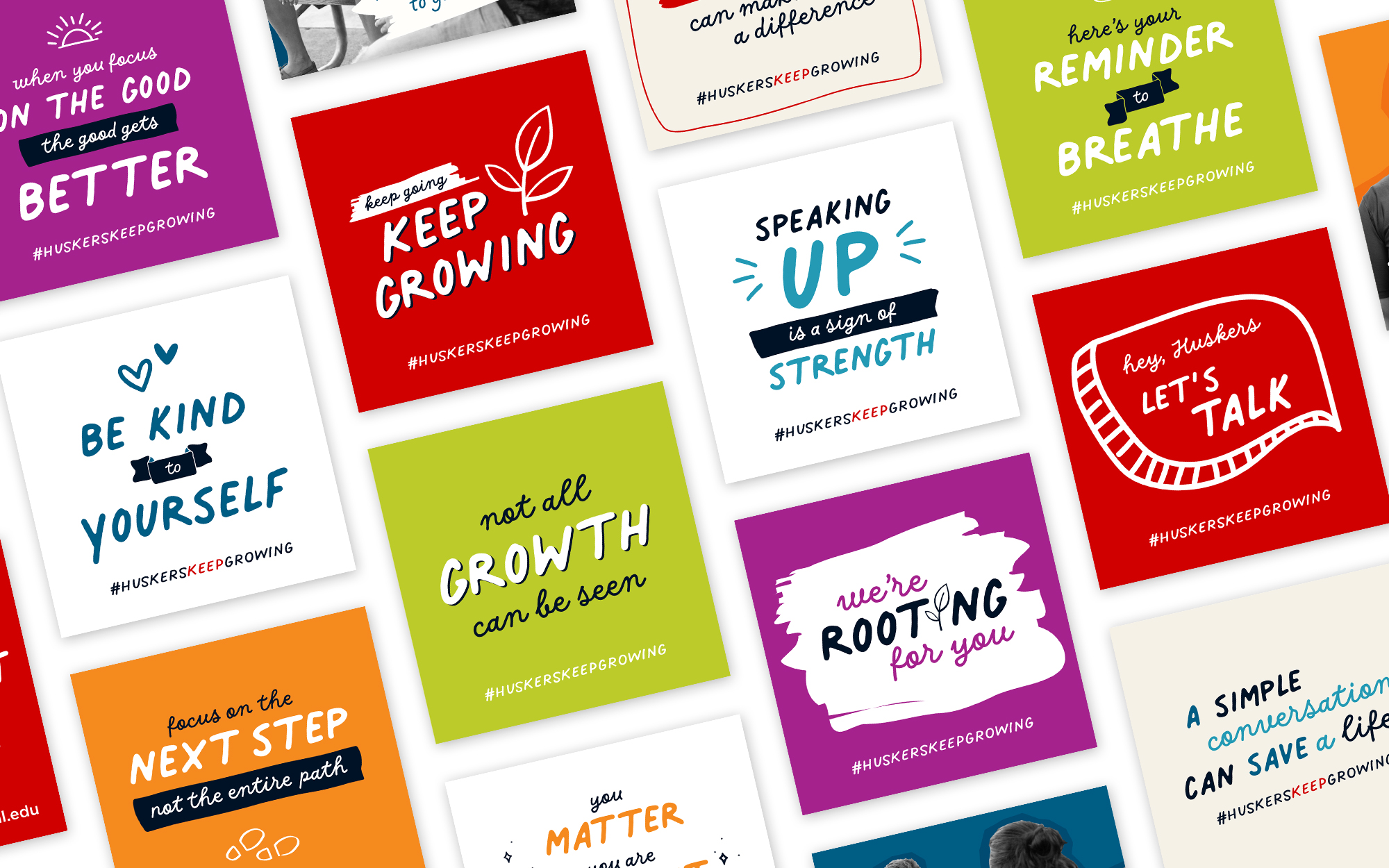 Huskers Keep Growing branding reflects the positive, inclusive and hopeful messaging designed to reach UNL students. Authenticity and peer-to-peer influence are key components. Bright colors and handwritten typography create a friendly, approachable feel.