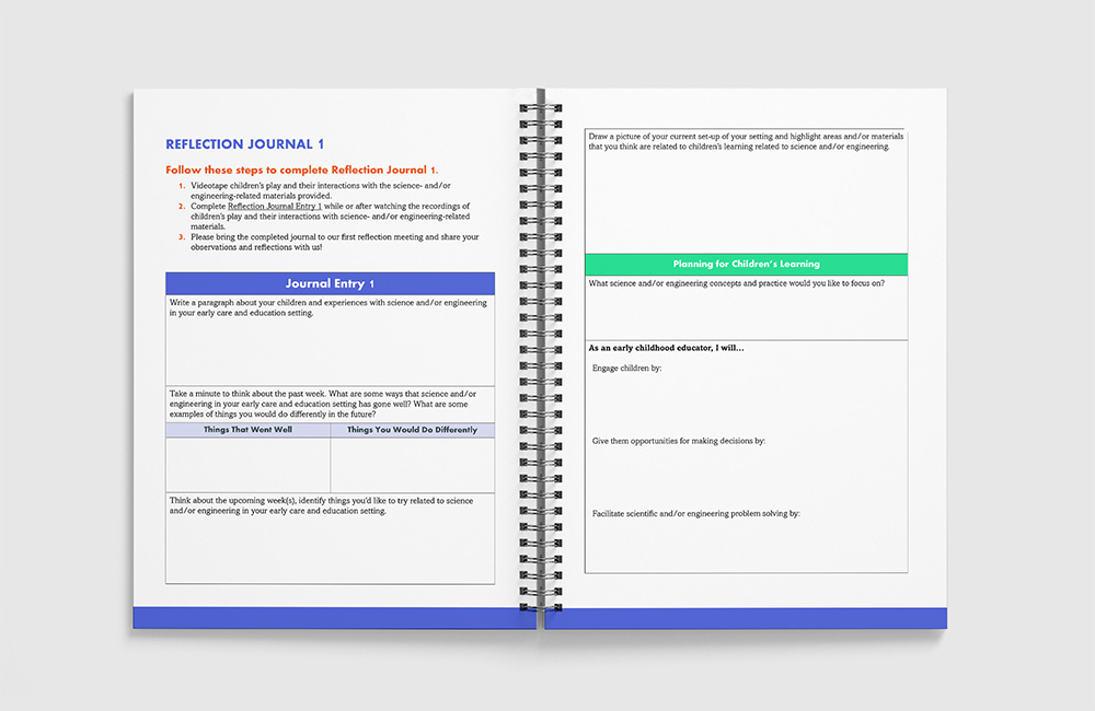 Brochures offer preschool teachers quick science lessons and classroom applications. Reflective journals give teachers space to document their experiences and design lessons.